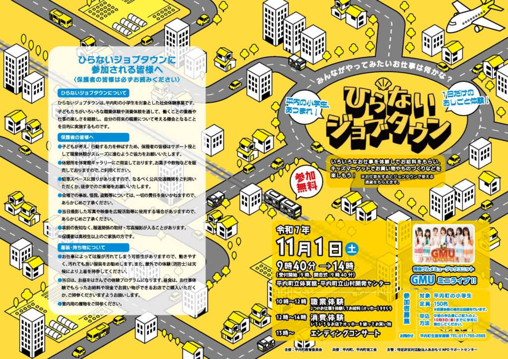 【ひらないジョブタウン出店者さん募集しています!】 〜子ども達の未来を地域で育もう〜という思いで小学生職業体験事業「ひらないジョブタウン」に取り組んで6年目、今年は11月2日(土)に開催します。 お仕事体験メニューはなんと16種類!こんなにいろ...