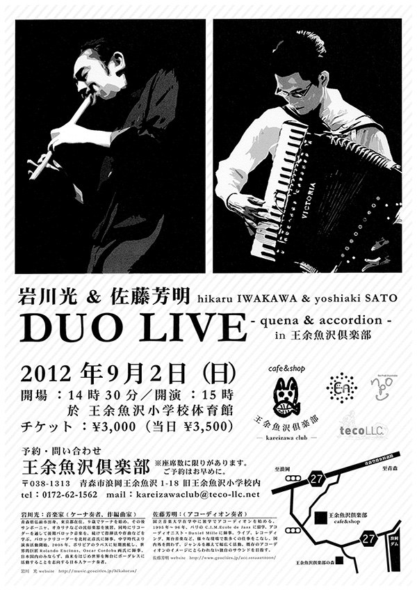 岩川光&佐藤芳明 DUO LIVE 2012 9/03 かれいざわプロジェクト 2012年9月3日 日時・ところ 2012年9月2日(日) 開場 14時30分 開演 15時 チケット 3000円 予約・お問い合わせ 王余魚沢倶楽部 〒038−1313 青森市浪岡王余魚沢1−18 旧王余魚沢小学校内 TEL 0172−62−1562 MAIL kareizawaclub@teco-llc.net かれいざわプロジェクト 王余魚沢 よかったらシェアしてね! URLをコピーしました! URLをコピーしました! 「王余魚沢の里山歩き、手入れを体験する」ワークショップのお知らせ 第5回全国藍染め工房展 この記事を書いた人 admin 関連記事 王余魚沢倶楽部の休業について 2019年10月22日 【王余魚沢倶楽部】冬期休業のお知らせ 2016年12月16日 森とカフェ王余魚沢倶楽部 臨時休業のお知らせ 2016年8月6日 『橙duo vol.0 release live in 王余魚沢倶楽部』 2016年7月25日 森とカフェ王余魚沢倶楽部 臨時休業のお知らせ 2016年6月24日 お待たせしました!6月4日(土)オープンです! 2016年5月16日 赤い羽根共同募金応援プロジェクトへのご支援ありがとうございました。 2016年4月11日 赤い羽根共同募金応援プロジェクトへのご支援をお願いします 2016年2月11日