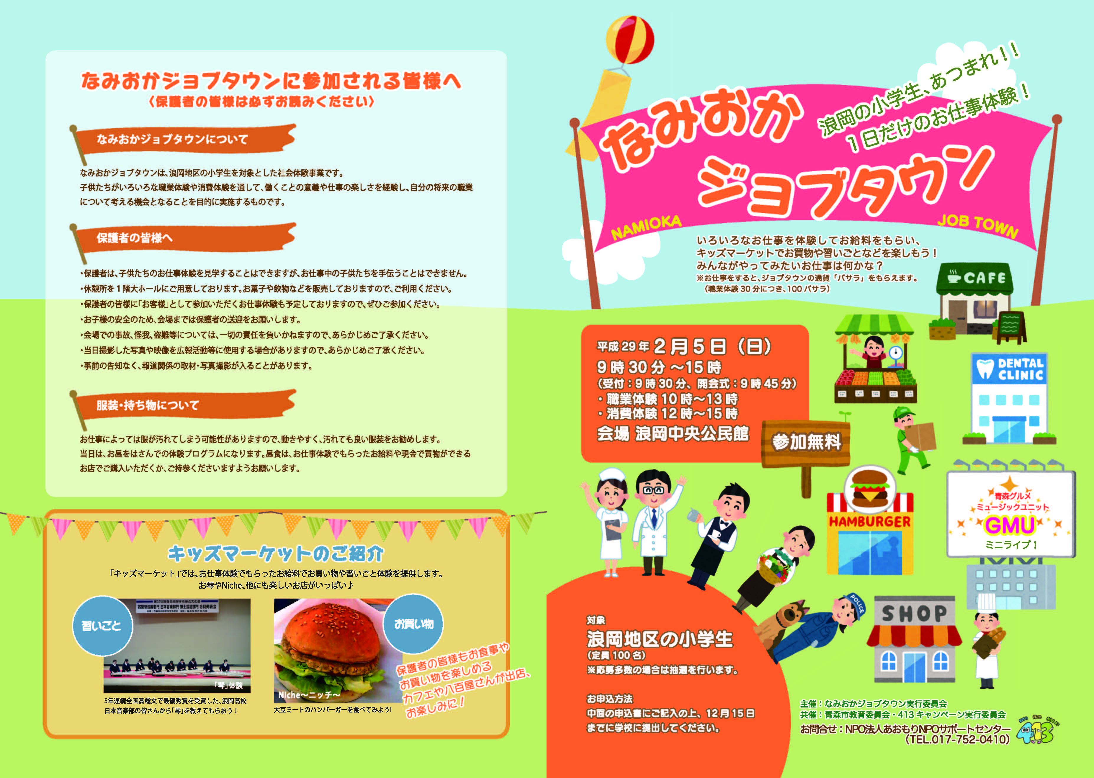 あおもりNPOサポートセンターは、青森市教育員会・413キャンペーン実行委員会の委託を受け、子供の職業体験イベント「なみおかジョブタウン」を開催します。青森市浪岡地区の小学生を対象に、子供たちがいろいろな職業体験や消費体験を通して、働くことの意義や仕事の楽しさを経験し、自分の将来について考える機会となることを目的に実施するものです。