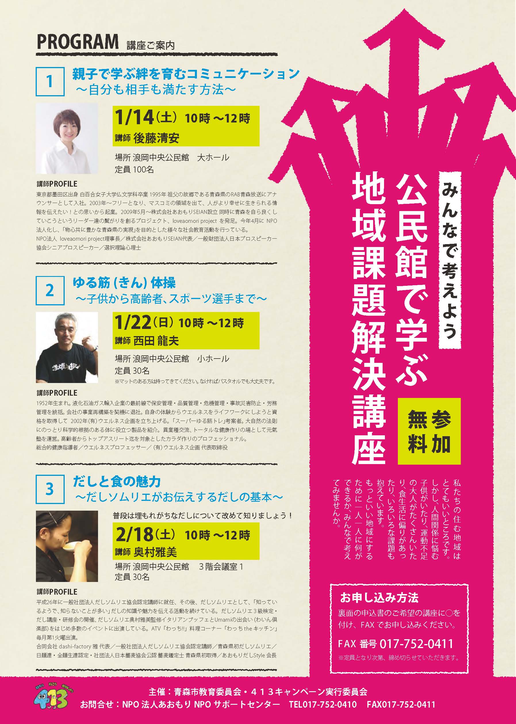 あおもりNPOサポートセンターは、青森市教育員会・413キャンペーン実行委員会の委託を受け、【みんなで考えよう!公民館で学ぶ地域課題解決講座】を開催します。