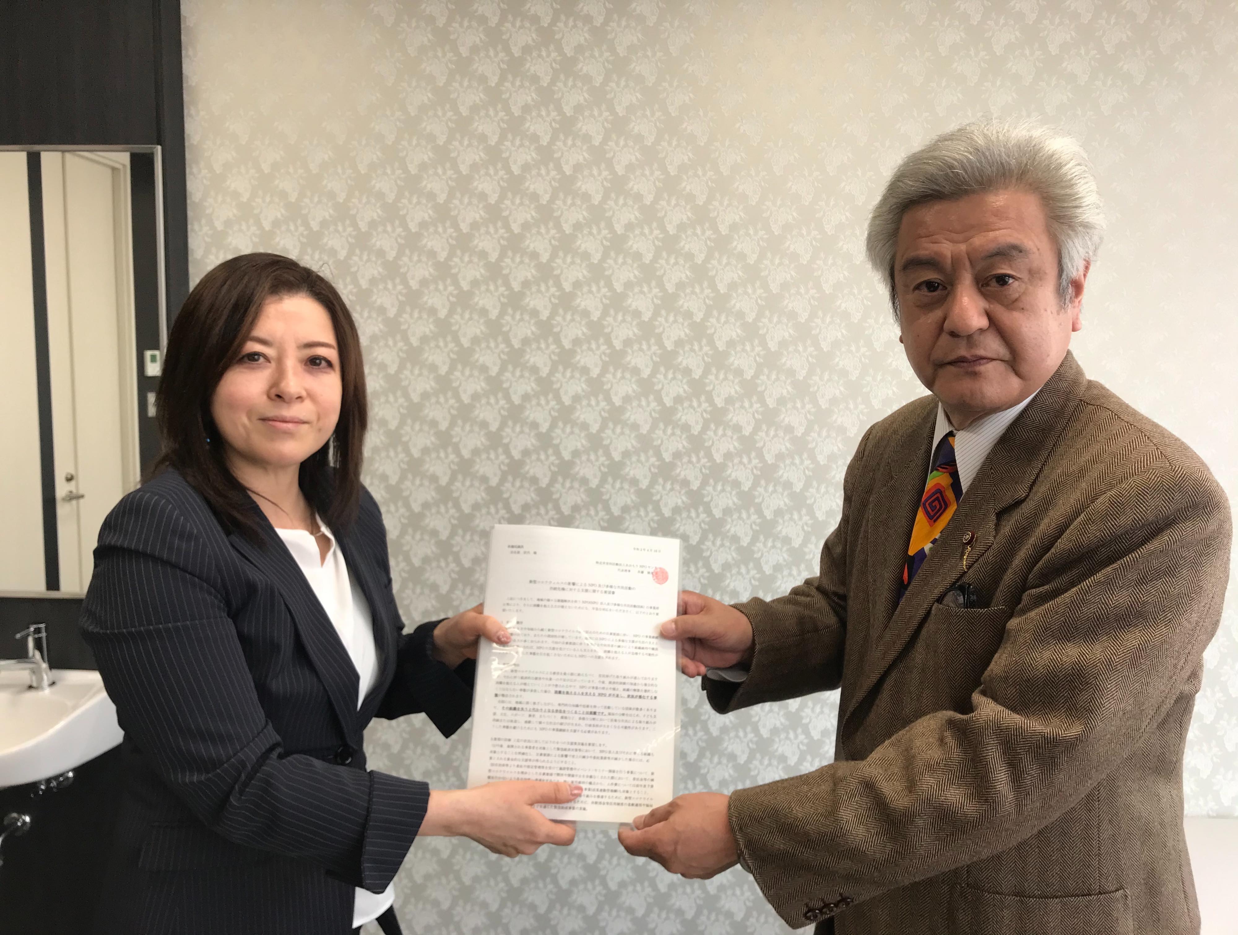 本日青森市議会議員 奈良祥孝さんにお会いし、地域の様々な課題解決を担うNPOの事業停止等により、さらに困難を抱える方が増えないためにも早急な対応をいただくための要望書と、「新型コロナウイルス感染拡大への対応及び支援に関する青森県内NPO法人緊急アンケート」の結果を、田名部匡代参議院議員にお渡しいただくことになりました。