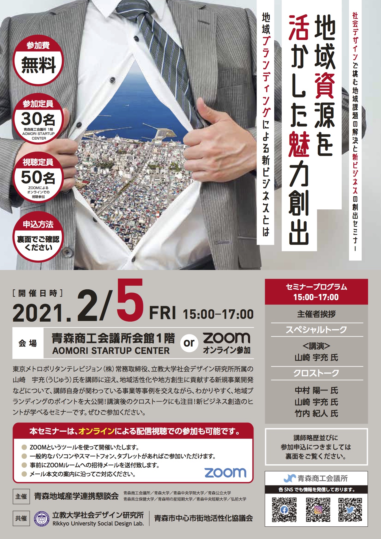 東京メトロポリタンテレビジョン(株)常務取締役、立教大学社会デザイン研究所所属の 山崎 宇充(うじゅう)氏を講師に迎え、地域活性化や地方創生に貢献する新規事業開発 などについて、講師自身が関わっている事業等事例を交えながら、わかりやすく、地域ブ ランディングのポイントをお話ししていただきます。