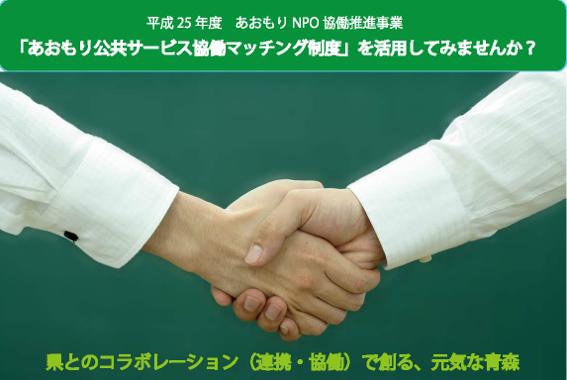 県とのコラボレーション(連携・協働)により、あおもりの元気を創りませんか? 地域課題解決のためNPO法人が事業を行う時、「あおもり公共サービス協働マッチング制度」を利用して県と協働することができます。 県がNPOと連携・協働したいテーマを示して... -