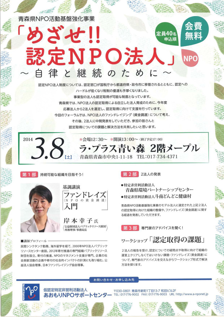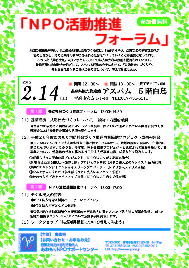 2月14日、青森県観光物産館アスパムにて【NPO活動推進フォーラム】を開催しました。県内のNPO法人、行政職員、一般の方々30名を超える参加者にお集まりいただき、「共助社会」づくりや、それを支えるNPO法人のあり方について考えました。 第1部 共... -