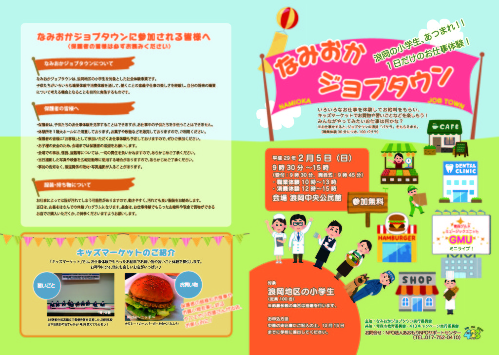 おかげさまをもちまして終了いたしました。 あおもりNPOサポートセンターは、青森市教育員会・413キャンペーン実行委員会の委託を受け、子供の職業体験イベント「なみおかジョブタウン」を開催します。青森市浪岡地区の小学生を対象に、子供たちがいろ... -