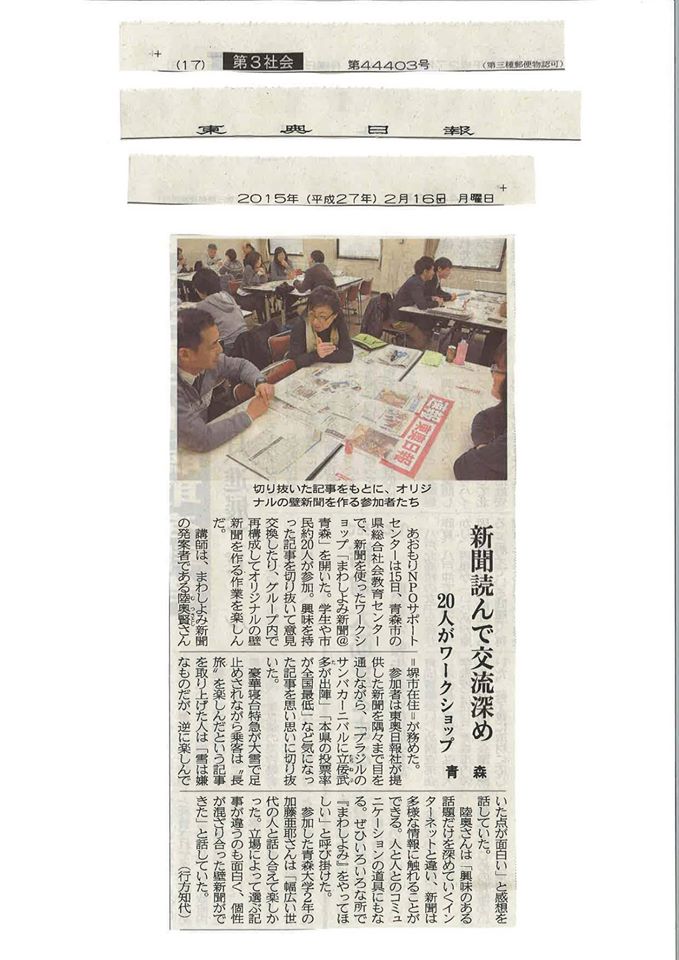 おかげさまをもちまして終了いたしました。 まわしよみ新聞@青森、完成した新聞を青森県総合社会教育センター掲示していただいておりますので、ぜひ足を止めてご覧いただければと思います。 期間:平成27年2月23日 〜 平成27年3月16日 場所:青... -