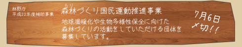自然環境への関心が高まり、持続可能な社会の創出に向かって様々な 活動や事業が話題となっております。林野庁においても「森林づくり国民 運動」を推進するために様々な取り組みが成されております。 このような中、地球温暖化防止や生物多様性保全に向け... -